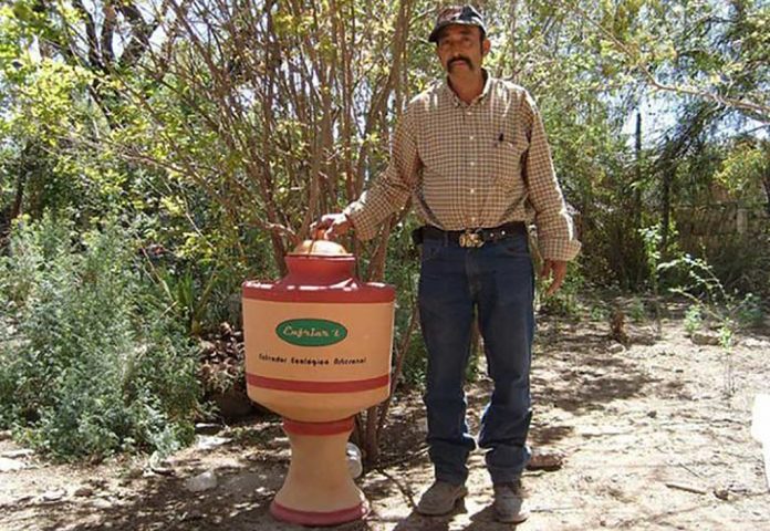 A geladeira é feita de um tipo poroso de argila de Gujarat, região da Índia onde Prajapati tem sua oficina. Você coloca água em um tanque de retenção de 5 galões na parte superior e ela gradualmente escorre através do material. Em um dia quente, a água evapora, resfriando a argila e deixando o conteúdo relativamente frio. Prajapati diz que a geladeira está oito graus Celsius menos quente do que a temperatura ambiente.