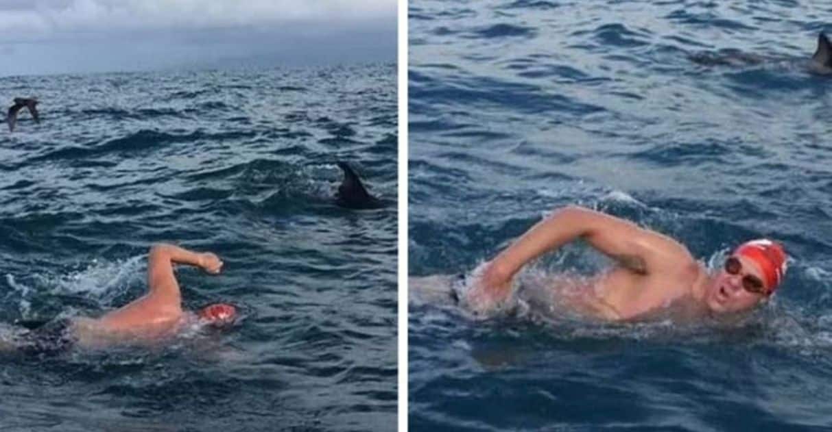 Apesar do perigo, o homem pensou que a única coisa a fazer naquele momento era manter a calma e continuar nadando, esperando que o grande predador encontrasse algo mais interessante para perseguir.