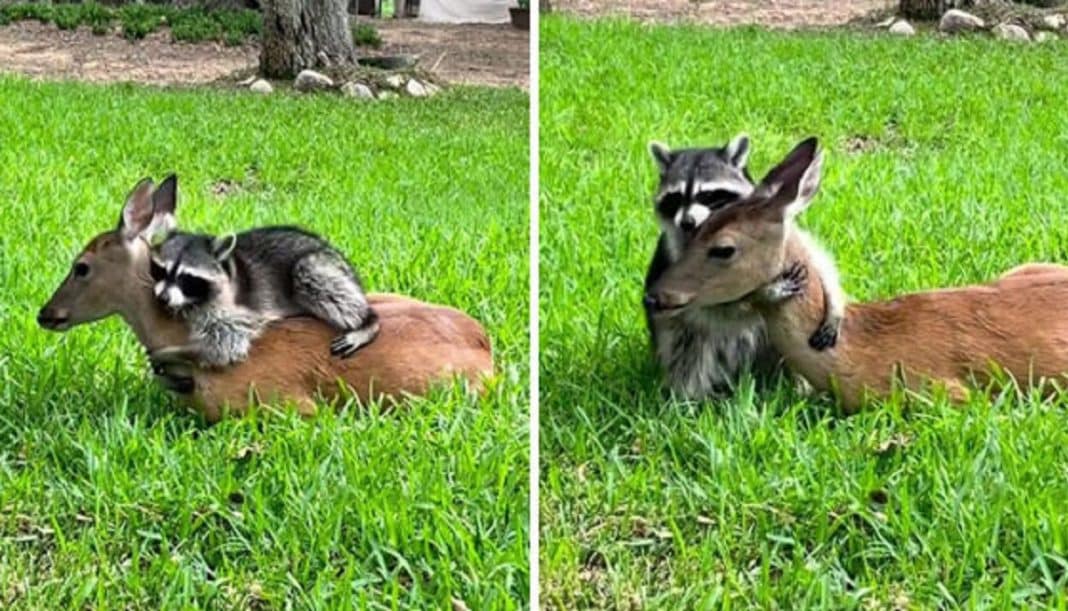 Coiote e texugo . Bebê rinoceronte e zebra órfãos . Amizades improváveis entre animais são nada menos que incríveis, e agora podemos testemunhar outra especial entre duas criaturas que são novamente muito diferentes – um guaxinim e um cervo.