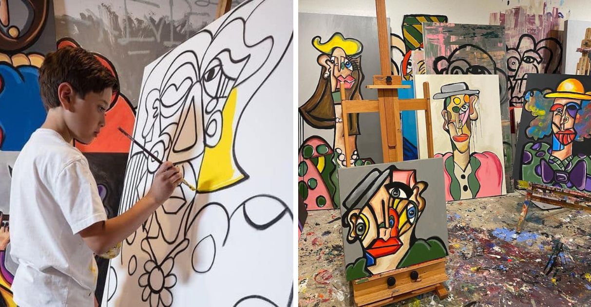 O menino também começou a assistir a vídeos sobre pintura, eventualmente sujando as mãos e experimentando por conta própria.