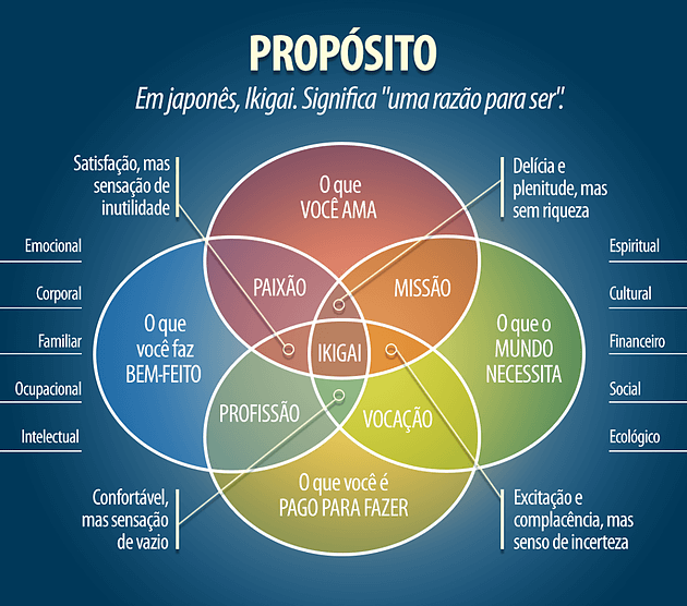 Todos têm – consciente ou inconscientemente – um Ikigai, ou seja, um propósito que os faz acordar todos os dias, e bem cedo. Quando não se tem propósito na vida, não há razão nenhuma para viver. Não há felicidade, logo não se justifica uma vida longa. Na tabela a seguir, você pode conferir os pontos que precisamos equilibrar no mundo de hoje se pretendemos encontrar a nossa razão de ser. Sugiro que você reflita um pouco sobre isso.