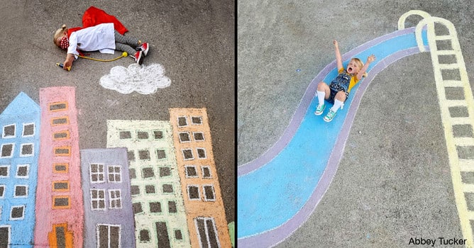 Com a ajuda de um simples giz na calçada, a menina de 3 anos percorre montanhas-russas, desliza nos escorregadores e sobrevoa prédios enquanto usa uma capa.