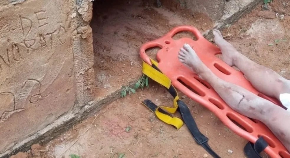 Pela manhã, coveiros que trabalham no local chamaram a PM após se depararem com um sepulcro fechado com tijolo, cimento fresco e sinais de sangue, e ouvirem uma voz vinda da gaveta funerária.