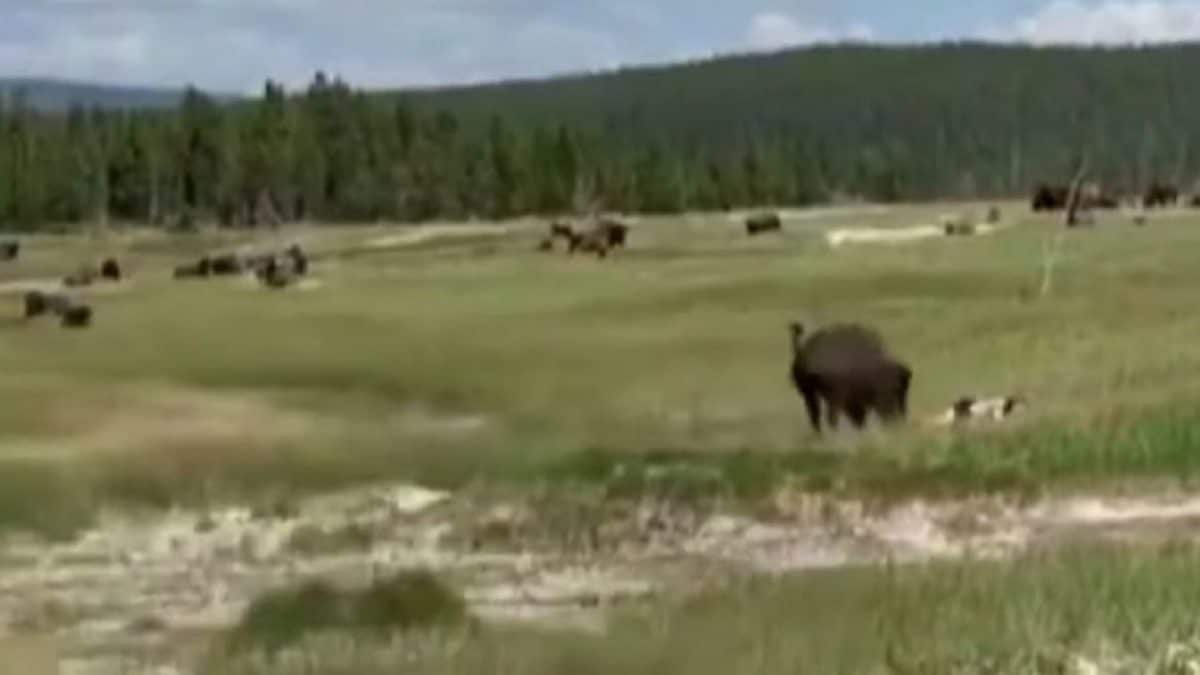 Uma mulher apanhada em um vídeo assustador tentando fugir de um bisonte no Parque Nacional de Yellowstone provou que, se tudo mais falhar – “se faça de morto”.