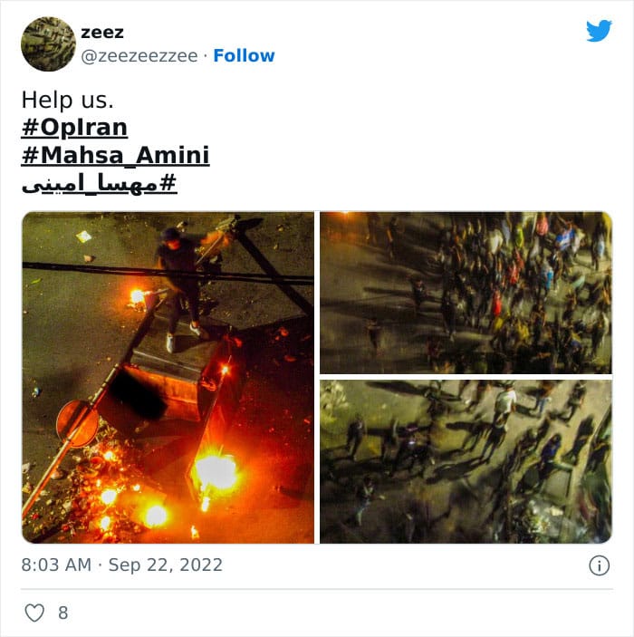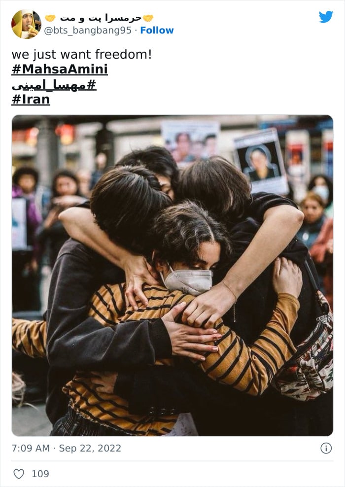 Em outro vídeo, ouvem-se pessoas gritando: “Não ao lenço na cabeça, não ao turbante, sim à liberdade e à igualdade!” Vídeos com variações da tag #MahsaAmini acumularam mais de 135 milhões de visualizações no TikTok.