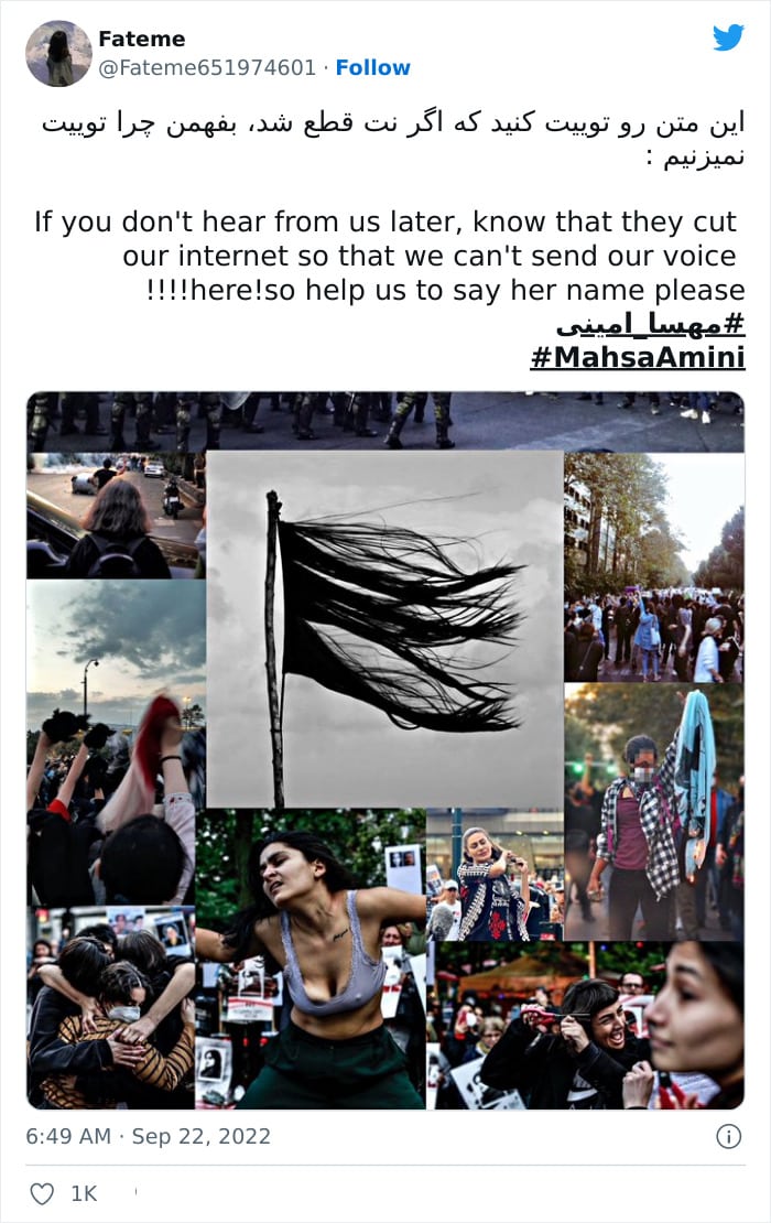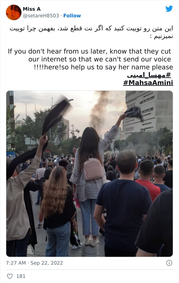 Na segunda-feira, 19 de setembro, “dados de rede em tempo real mostraram uma interrupção quase total na conectividade da Internet em Sanandaj, capital da província do Curdistão”. O ministro das Comunicações do Irã, Issa Zarepour, disse que os serviços de internet podem ser interrompidos por “fins de segurança e discussões relacionadas a eventos recentes” pelas forças de segurança.