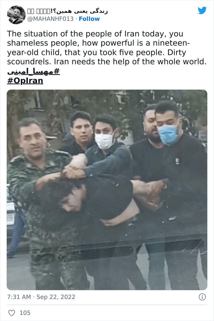 De acordo com o portal IranWire, ativistas de direitos humanos que falaram com a família dizem que a polícia agarrou Mahsa e a forçou a entrar em um veículo policial. Seu irmão, Kiarash, tentou intervir e foi informado que sua irmã estava sendo levada à delegacia para uma hora de “reeducação” e para receber “orientação” sobre seu traje.
