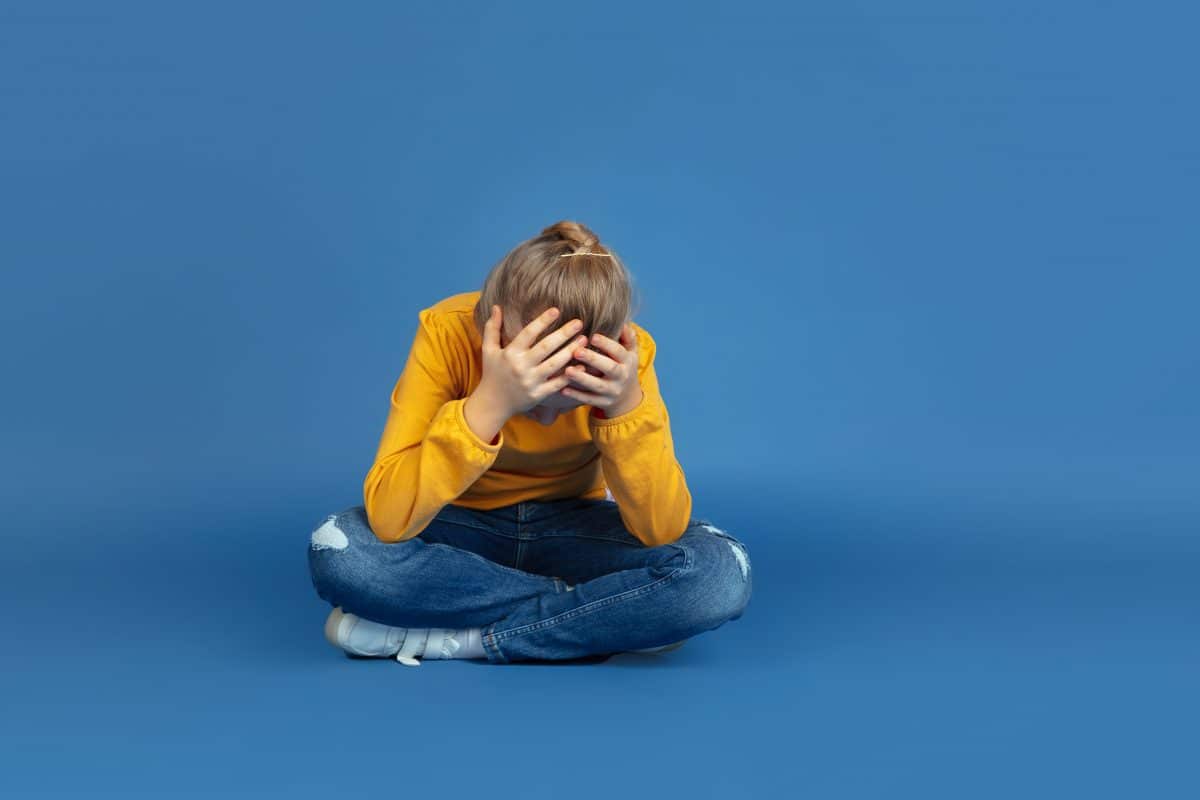 Portrait of sad little girl sitting isolated on blue studio background. How it feels to be autist. Modern problems, new vision of social issues. Concept of autism, childhood, healthcare, medicine.