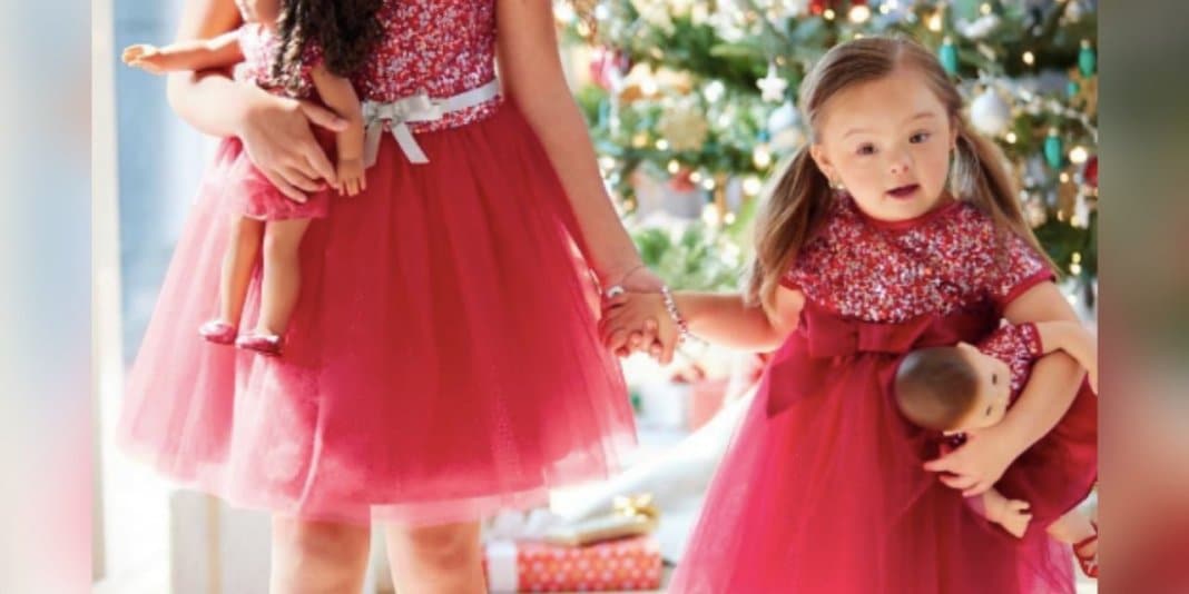 Kimble modela um vestido vermelho combinando junto com outra criança e uma boneca American Girl. Kennedy Garcia , também um modelo com síndrome de Down, foi incluída na publicidade anterior da American Girl.