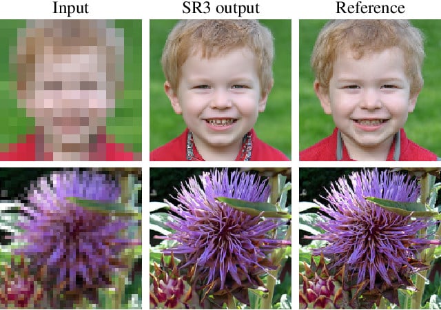 É assim que funciona o algoritmo SR3 desenvolvido pelo Google : ele adiciona ruído ou imprevisibilidade a uma imagem e, em seguida, reverte o processo – da mesma forma que um editor de imagens tentaria refinar suas fotos de férias. Assim, a partir de uma série de cálculos baseados em um grande banco de dados de imagens, SR3 é capaz de imaginar como seria uma versão em alta resolução de uma foto de baixa qualidade. O software oferece resultados impressionantes de super-resolução para fotos de rosto e imagens naturais ao redimensionar para resoluções 4 a 8 vezes maiores que as da imagem de baixa resolução de entrada.