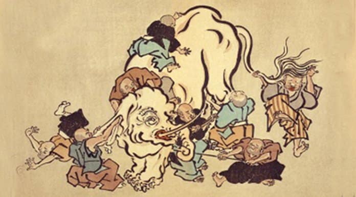 Monges cegos examinando elefante”, gravura de Hanabusa Itchō (1652–1724