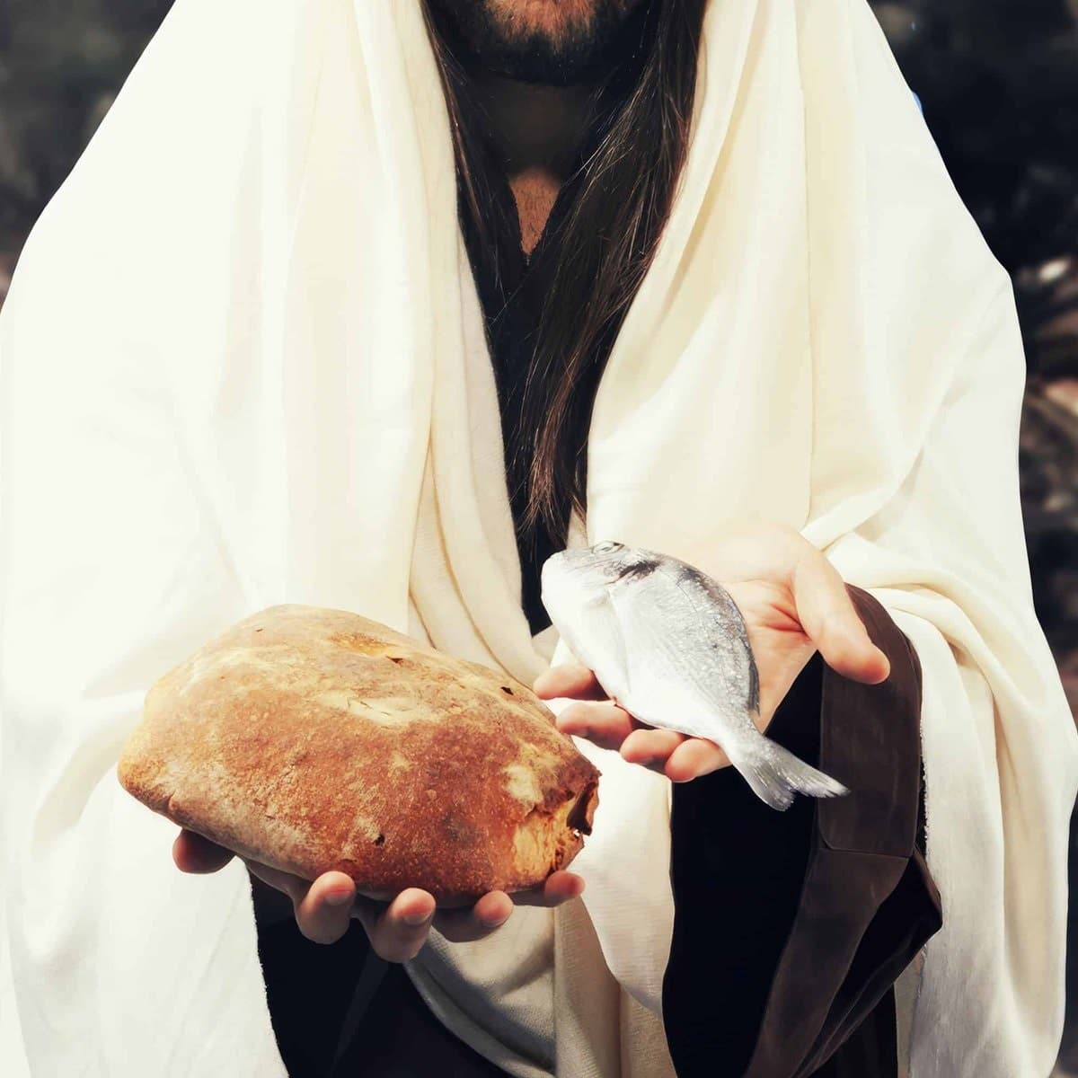 Já no evento da multiplicação, Jesus teria alimentado uma multidão de cinco mil pessoas com apenas cinco pães e dois peixes.
