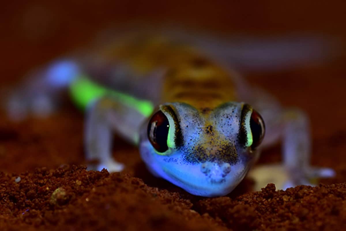 A lua é a única fonte de luz durante as viagens noturnas de caça dessas lagartixas nos desertos da Namíbia. O componente azul do luar é absorvido pela pele e emitido na forma de luz neon verde brilhante.