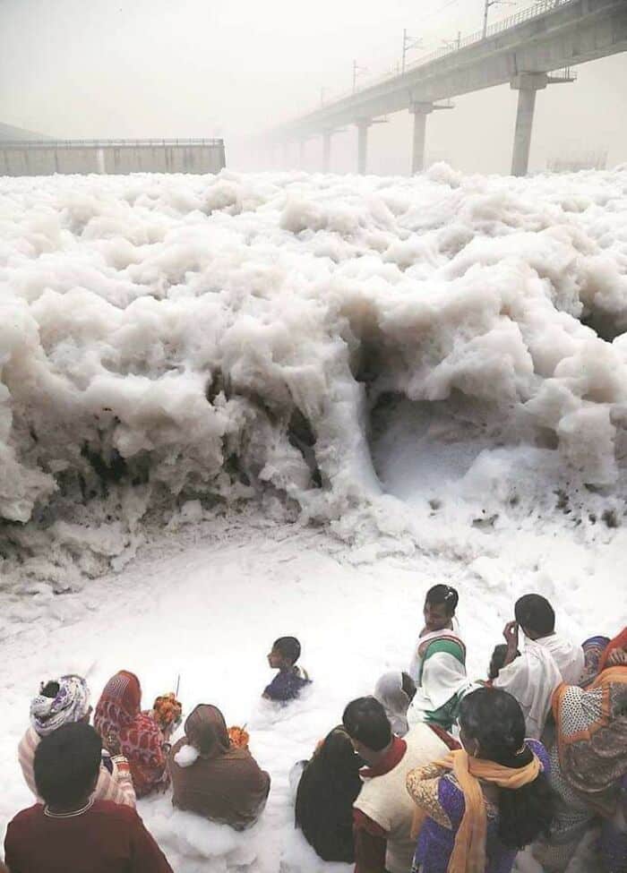 5 Índia – Pessoas que oferecem orações no rio Yamuna, que está espumando de resíduos industriais