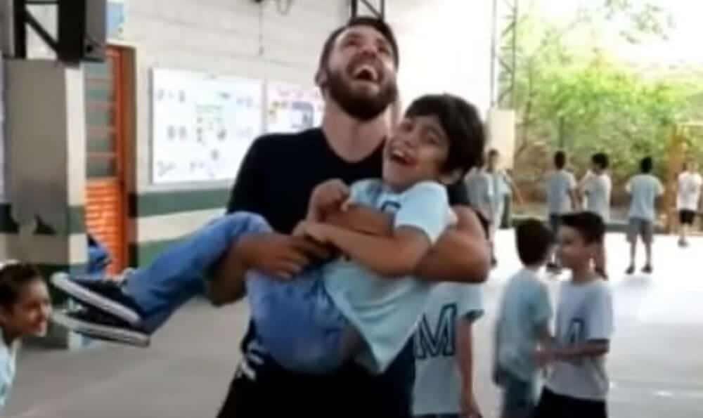 João Hoffmann é professor de educação física na escola Sítio I, onde Heitor, 7 anos, estuda. Na quinta-feira (31) ele conta que os alunos estavam em um período livre para brincadeiras quando Heitor viu um grupo pulando corda e pediu para pular junto com eles. Em resposta ao pedido, ele pegou o aluno no colo e pulou corda com ele.