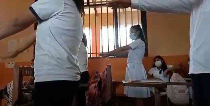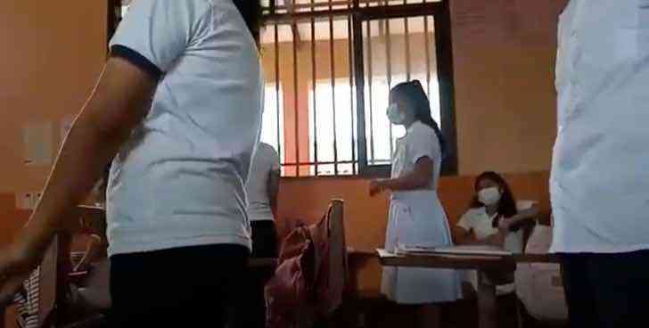 Havia pelo menos 4 alunos em pé na sala de aula enquanto os demais estavam sentados em suas carteiras.
