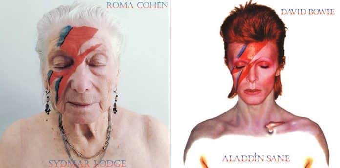 As fotos mostram capas icônicas pregadas como Adele’s 21 , The Clash’s London Calling e Aladdin Sane de David Bowie – que contou com Roma Cohen recriando o icônico personagem de Ziggy Stardust.