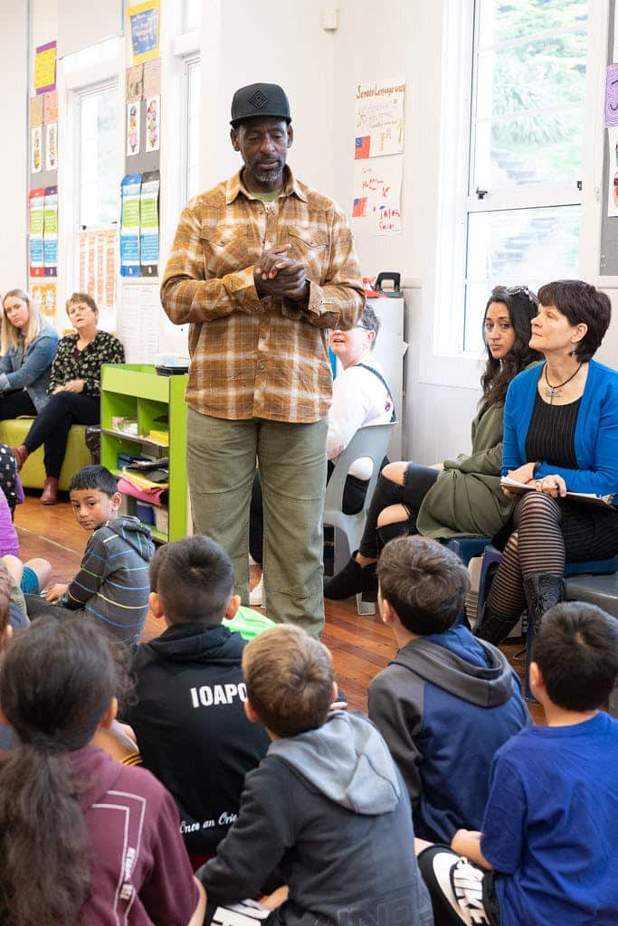 Ron Finley conversando com crianças em uma escola primária local. Wikimedia Commons.