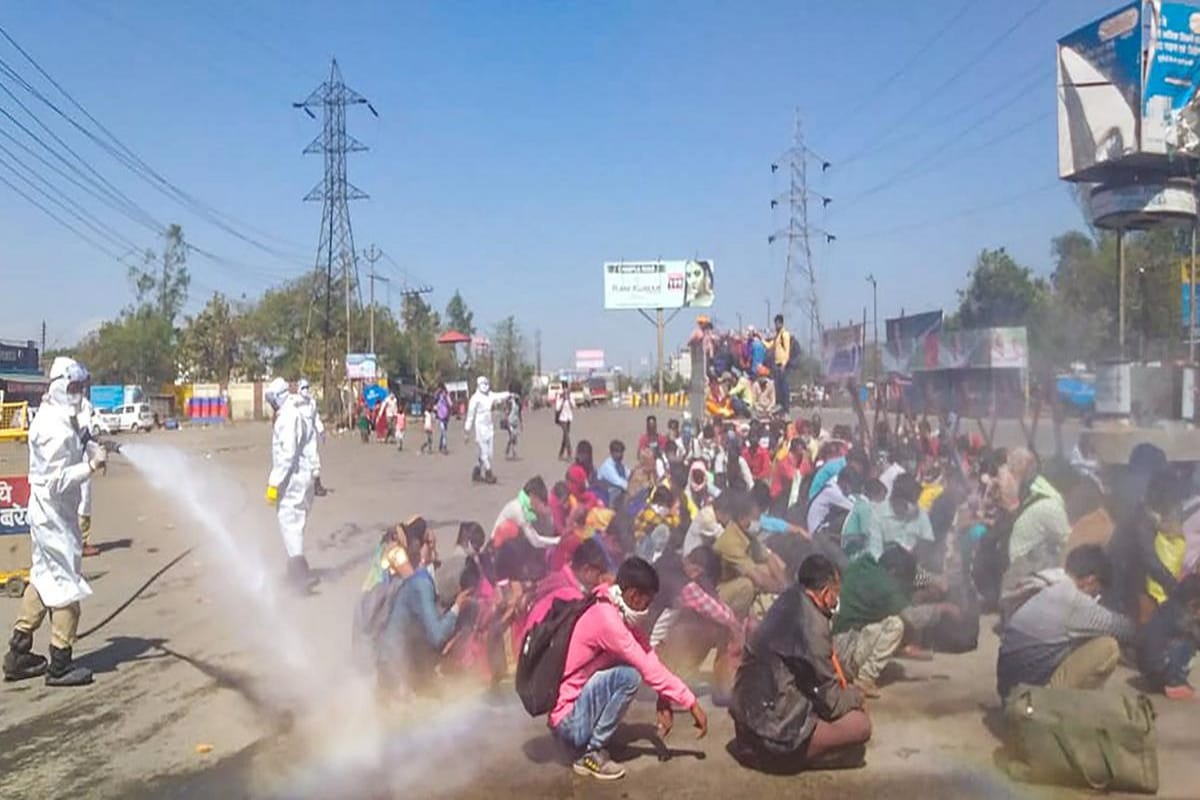 Trabalhadores migrantes indianos que retornaram a Uttar Pradesh depois que as fábricas pararam devido ao coronavírus e seus familiares foram pulverizados com desinfetante de alvejante quando entraram em Bareilly. Uma cena horrível na qual o Ministério Público abriu uma investigação.