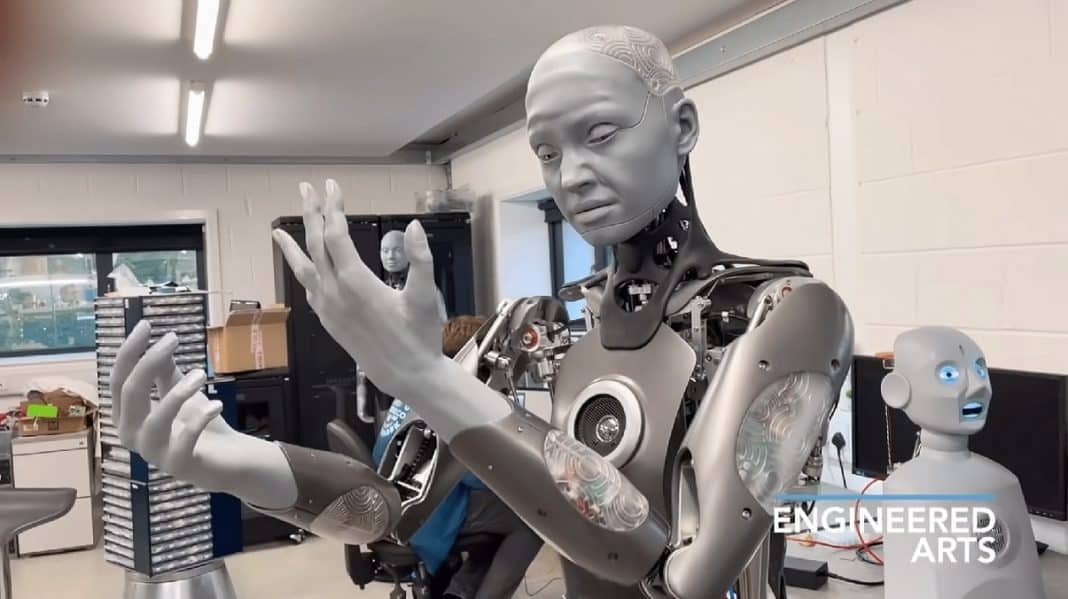 Este robô se chama Ameca. Criado pela Engineered Arts , é descrito pela empresa como uma “plataforma” para o desenvolvimento de futuras tecnologias robóticas. O credo da empresa é simples sobre o assunto: “Uma inteligência artificial que se parece com um humano requer um corpo artificial que se parece com o de um humano”. O principal objetivo da máquina é, portanto, possibilitar o trabalho nas interações homem-máquina, levando as expressões ao máximo de realismo possível.
