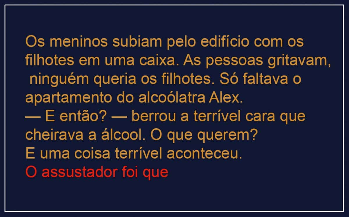 Uma hora depois, faltava apenas o apartamento do Alex, o alcoólatra. Ele foi deixado por último de propósito, porque Alex era um homem mau, de caráter pesado e tinha um olhar de lobo. Não dava para dizer que fosse completamente alcoólatra, mas sempre cheirava a álcool. E suas ações eram completamente imprevisíveis. Assim, as crianças o deixaram para visitar justamente por último, e com razão, supondo que não apenas ouviriam uma avalanche de insultos por causa dos filhotes. Eles poderiam, inclusive, receber alguns tapas. Alex não gostava de pessoas e as pessoas não gostavam de Alex. Mas havia uma diferença entre eles: Alex não tinha medo das pessoas, mas as pessoas tinham medo dele. Como não temer um homem forte, com a barba por fazer, sempre bêbado, que olha para você com a aparência de um lobo?