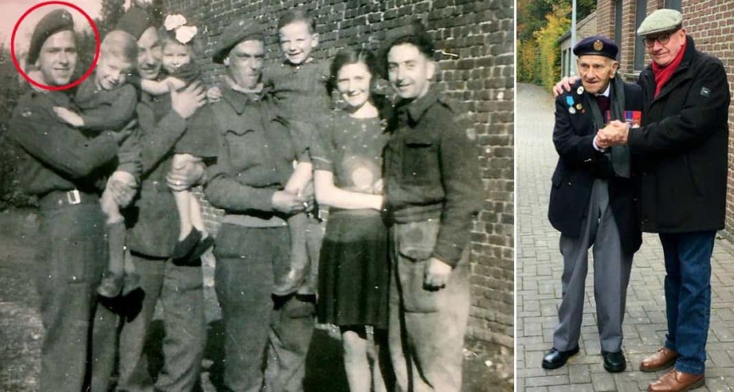 Um veterano do Dia D de 98 anos recriou uma foto tirada com um menino belga cuja família o levou 76 anos atrás.