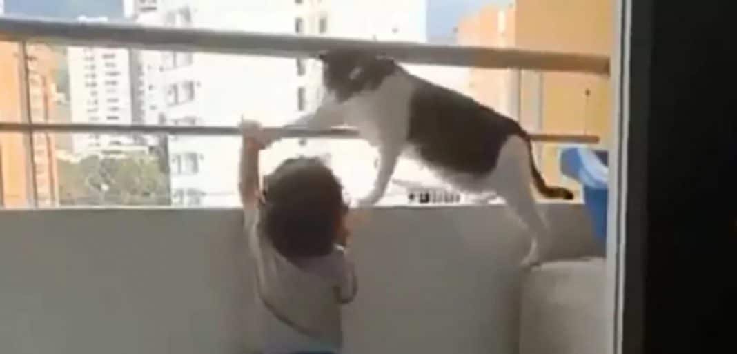 Uma família colombiana gravou um vídeo que rapidamente se tornou viral, no qual se mostra como o gato com quem compartilham suas vidas se encarrega de cuidar de seu filho . Nas imagens, vemos o menino tentando se agarrar ao parapeito da varanda para se levantar, mas após alguns segundos de cortesia, o gato se encarrega de acabar com suas esperanças.
