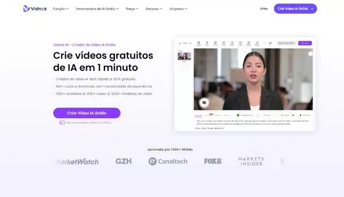 O Vidnoz Criador de Vídeo é a ferramenta carro-chefe da plataforma. Com ele, qualquer pessoa, mesmo sem habilidades avançadas em edição, pode criar vídeos de alta qualidade em minutos. A plataforma oferece uma variedade de modelos personalizáveis e um vasto número de avatares IA, permitindo que o usuário escolha personagens digitais para narrar ou protagonizar seus vídeos. Tudo isso com um processo intuitivo e automatizado, no qual a IA se encarrega de aspectos técnicos como a edição de cenas e a sincronização de áudio com vídeo.
