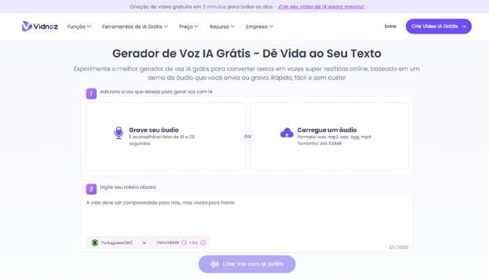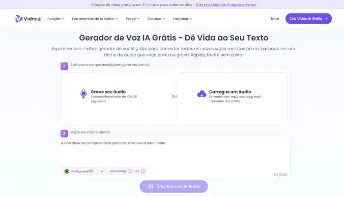 O Vidnoz Gerador de Voz IA é outra ótima ferramenta nesta plataforma. Ele permite que você crie narrações realistas usando tecnologia de conversão de texto em fala e clonagem de voz. Basta fazer upload ou gravar um trecho de áudio de 20 segundos e o Vidnoz captura as características do voz e o replica perfeitamente. Esta ferramenta é perfeita para quem precisa dublar um vídeo com uma voz natural e envolvente ou criar conteúdo de áudio e quer passar muito tempo gravando. O Vidnoz Gerador de Voz IA também pode ajustar o tom, o andamento e a emoção da voz, garantindo uma narração personalizada e profissional.