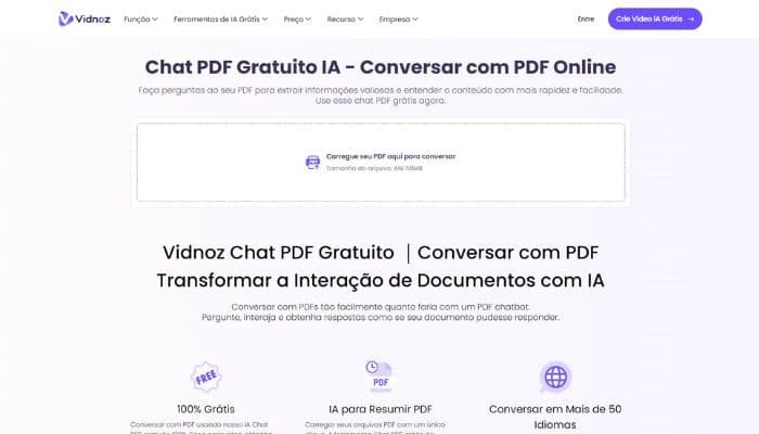 O Vidnoz ChatPDF é uma das ferramentas mais inovadoras da plataforma, destinada a facilitar a interação com documentos em PDF. Usando IA, o ChatPDF permite que você faça perguntas a qualquer documento PDF, e ele fornecerá respostas claras e precisas com base nas informações contidas no arquivo. Essa funcionalidade é especialmente útil para quem trabalha com grandes volumes de dados ou textos complexos e precisa de uma maneira rápida de obter respostas sem a necessidade de ler o documento inteiro.