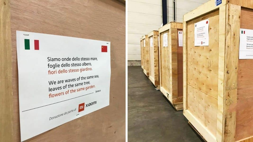 A gigante da tecnologia de consumo Xiaomi enviou a remessa para o Departamento de Proteção Civil italiano, e eles grampearam ao lado dos caixotes uma antiga linha de poesia do filósofo romano Seneca :